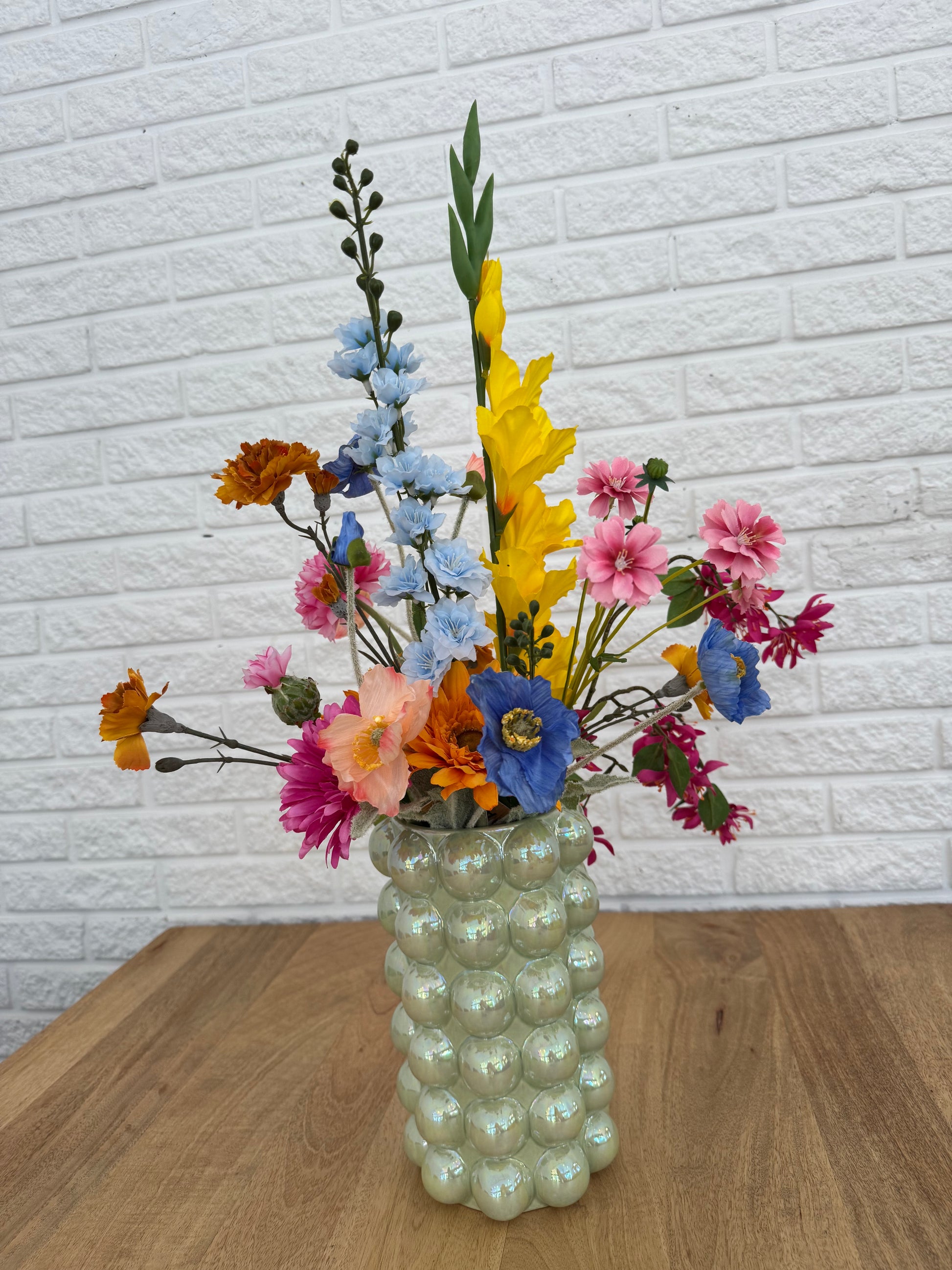 Een prachtig kleurrijke zijde boeket. Verkrijgbaar met en zonder vaas