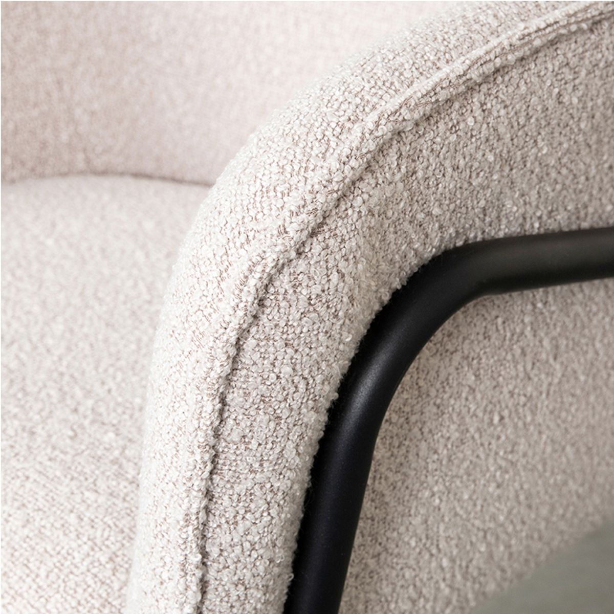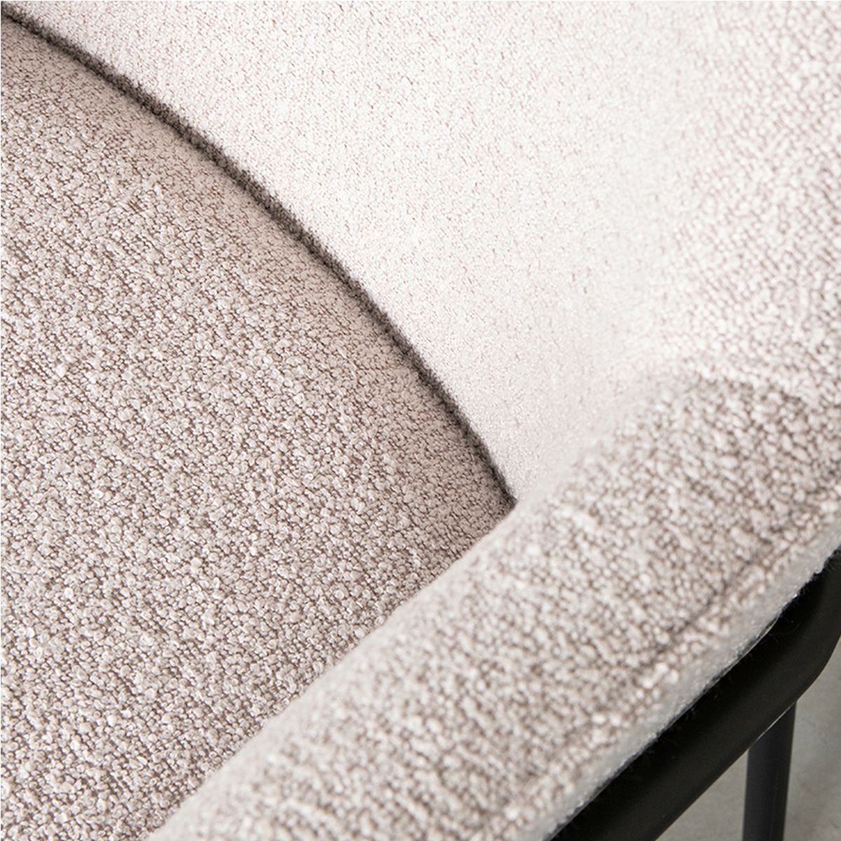 Dexter, uitgevoerd in naturel boucle heeft een ronde, robuuste zitting voorzien van elegante rondingen en armleuningen. De mooie ‘curve’ van de zitting naar de arm- en rugleuning geeft deze stoel ontzettend veel charme en comfort. De combinatie van de robuuste en grove zitting en het subtiele zwarte frame maakt deze stoel tot een extra uniek exemplaar. De zitting lijkt bijna te zweven tussen het frame!