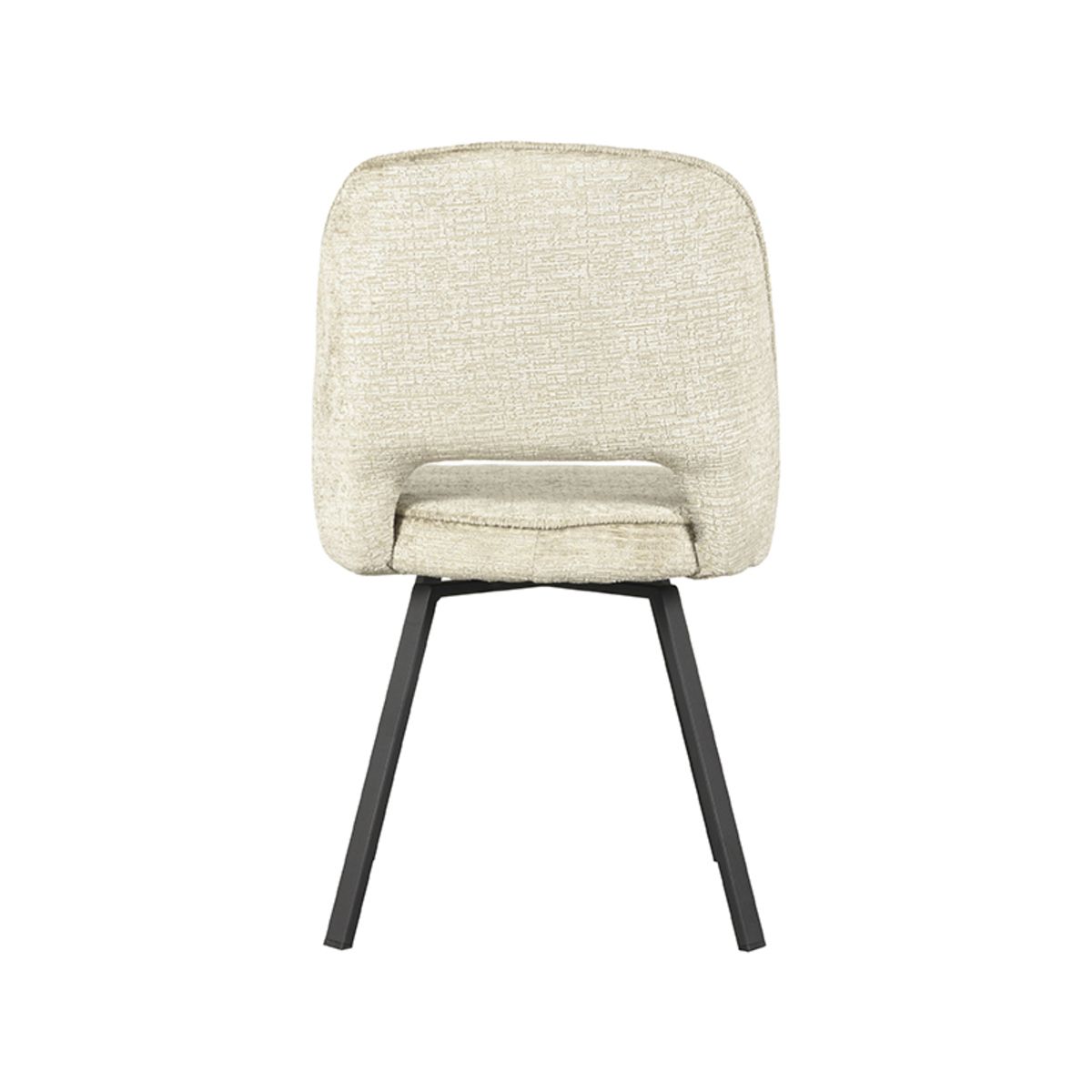 Eetkamerstoel Lewis heeft een opening in de rug, wat bijdraagt aan het zachte uiterlijk van de stoel. De hoogwaardige stof cream elegance, waarmee deze stoel bekleed is, geeft de stoel een moderne uitstraling. Het model is gemakkelijk te combineren en is hierdoor goed te plaatsen in ieder interieur. Lewis is voorzien van een zwart metalen frame met een slim draaisysteem, waardoor het gebruiksgemak van deze stoel ontzettend groot is.