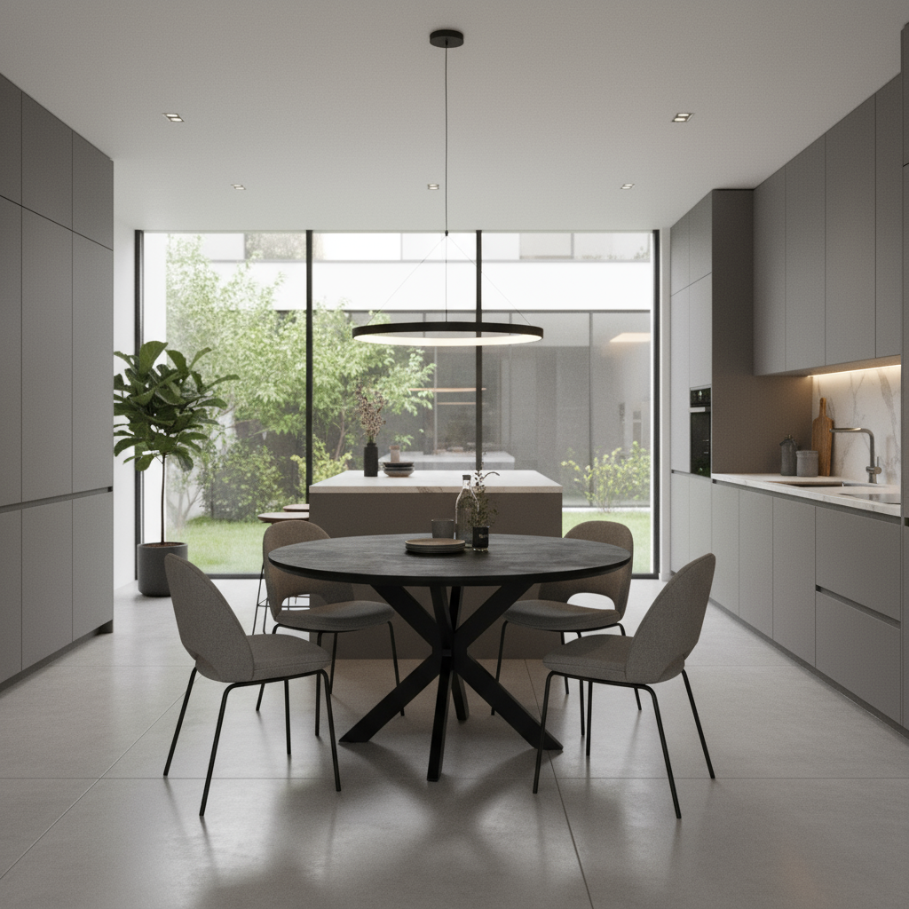 De ronde vorm maakt de tafel perfect voor gezellige diners en bevordert een intieme sfeer, ideaal voor zowel kleinere ruimtes als grotere woonkamers. Het minimalistische ontwerp combineert moeiteloos functionaliteit en esthetiek, waardoor deze tafel een eyecatcher is in elk interieur.