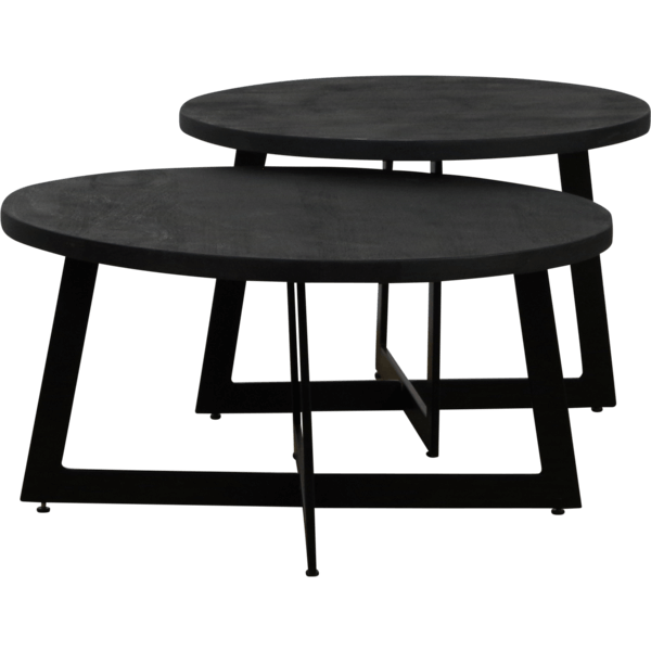 De Amira Salontafelset is een moderne en stijlvolle 2-delige set met een strak, zwart rond tafelblad en een opvallende zwarte kruispoot. Deze eigentijdse tafels voegen een luxe en minimalistische touch toe aan elk interieur, perfect voor een moderne woonkamer.