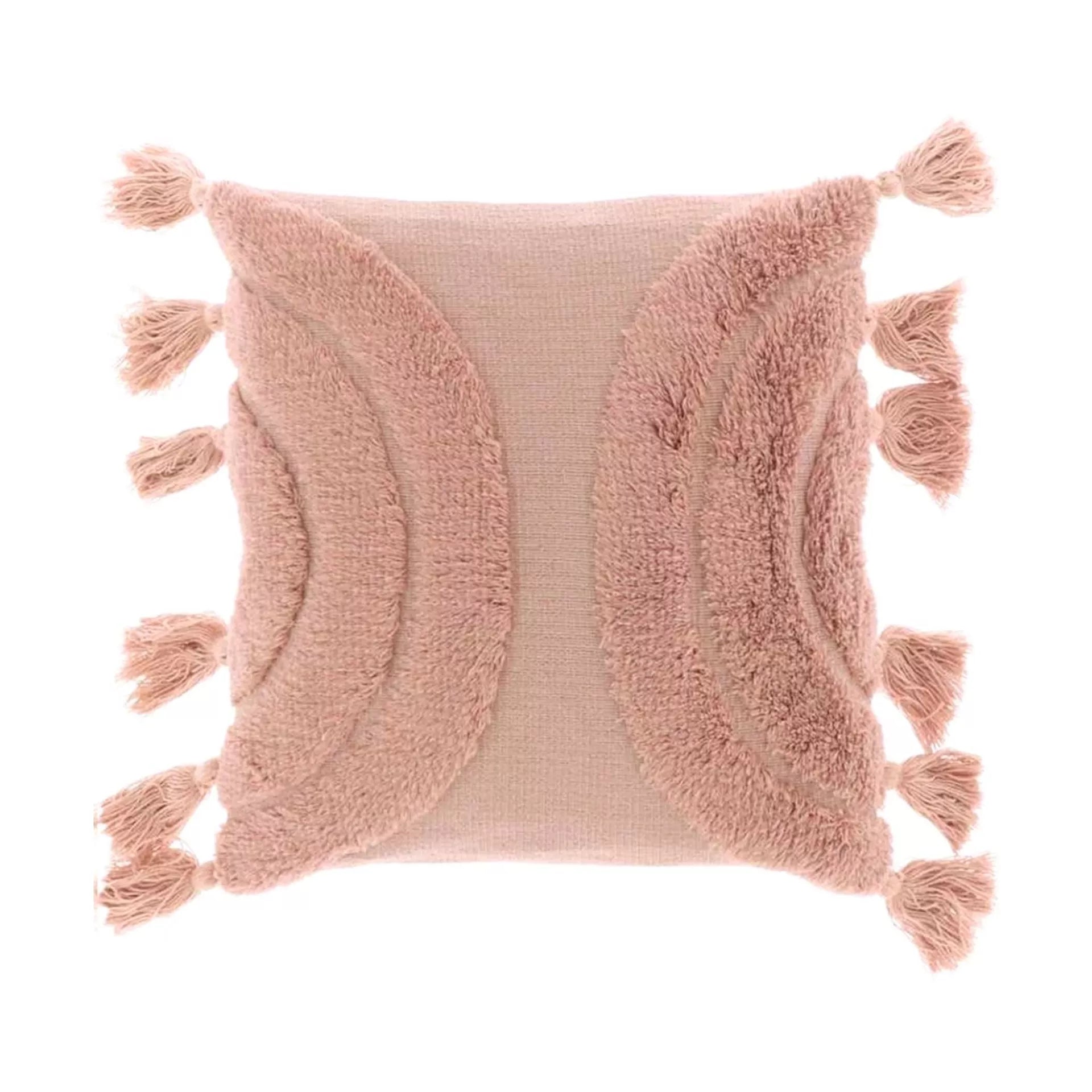 Leuke roze kussentje met franjes eraan. Kussen is 45 bij 45.