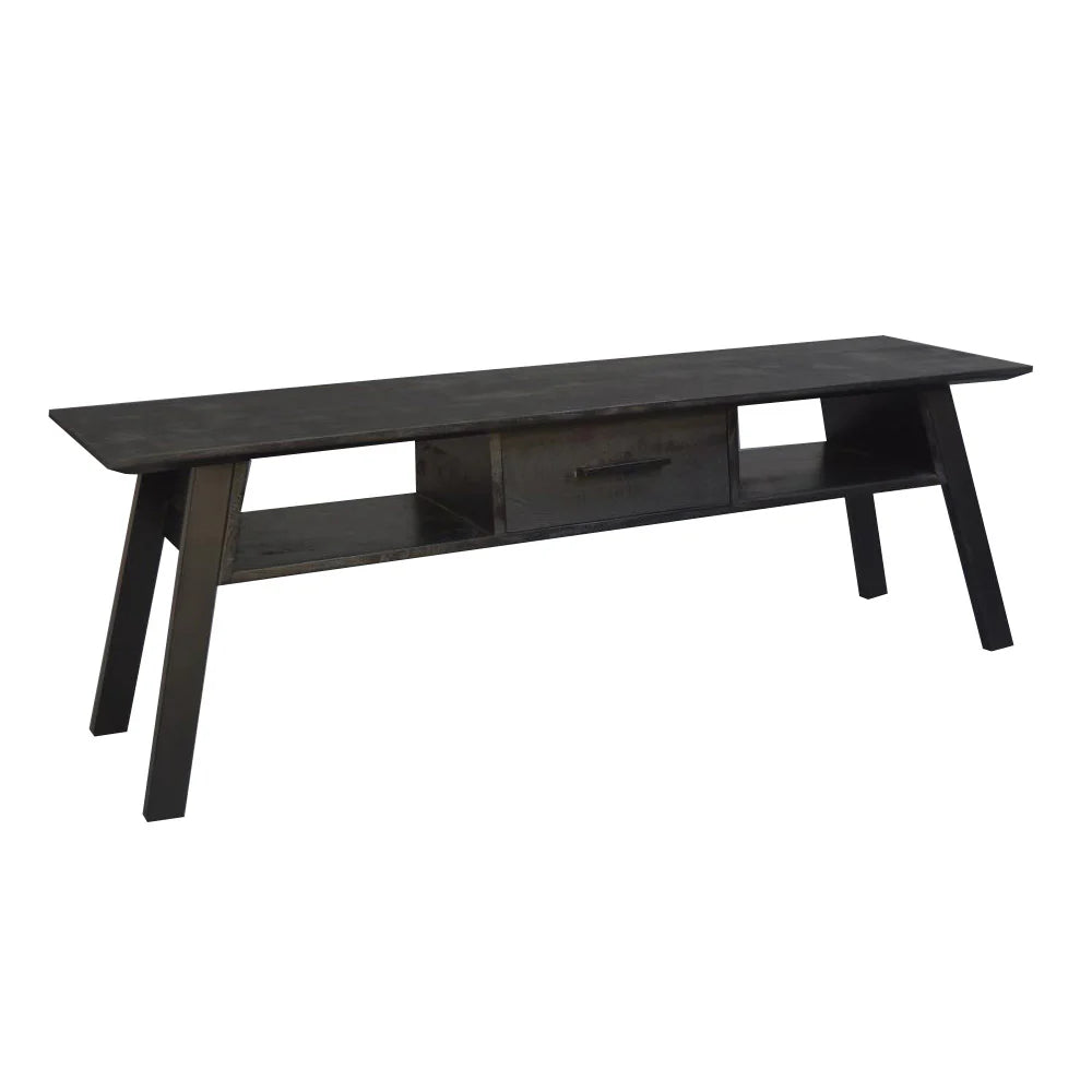 Het zwarte TV-meubel is de perfecte combinatie van stijl en functionaliteit. Met zijn minimalistische design voegt dit meubelstuk een vleugje elegantie toe aan elke woonkamer. Het meubel is uitgerust met één lade en twee open vakken, ideaal voor het opbergen van accessoires, boeken en multimedia. Het verjongde blad van zwart mangohout straalt luxe en vakmanschap uit, terwijl de strakke lijnen en de zwarte poedercoating een moderne en industriële uitstraling geven. Dit TV-meubel is een praktische en stijlvolle aanvulling op elk interieur. Afm: 150x40x50 cm