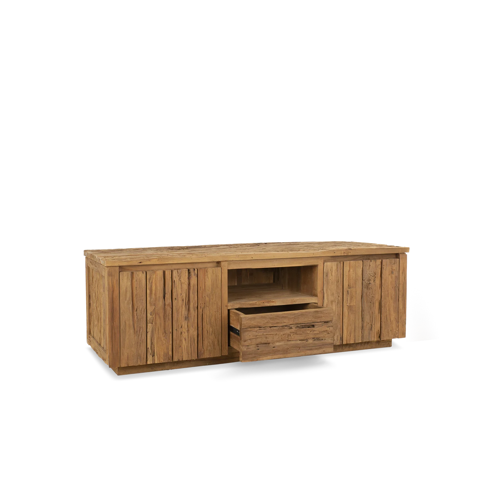 Het Tv-meubel is een stijlvolle en praktische toevoeging aan je woonkamer. Gemaakt van gerecycled teak, heeft het meubel een warm en grof uiterlijk dat perfect past bij een robuuste, natuurlijke inrichting. Het meubel beschikt over twee deuren, een lade en een open vak, wat volop opbergruimte biedt voor apparatuur, accessoires en andere benodigdheden. De verborgen grepen geven het geheel een strak en modern design, terwijl het teakhout zorgt voor een tijdloze, duurzame uitstraling. Dit meubel combineert functionaliteit met een stoere en unieke esthetiek. Verkrijgbaar in 2 maten