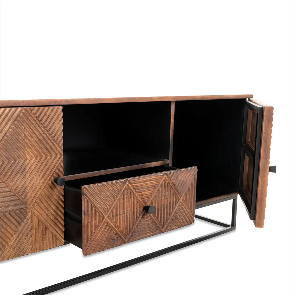 De Jasmin TV-kast met twee deuren en lade is een perfecte aanvulling voor je woonkamer of entertainmentruimte. Het geometrische driehoekige midcentury patroon voegt een dynamisch element toe aan je interieur. Gemaakt van hoogwaardig massief mangohout, straalt deze kast tijdloze schoonheid en functionaliteit uit. De duurzame eigenschappen van het hout garanderen jarenlang gebruik. De twee deuren bieden voldoende opbergruimte voor mediacomponenten en dvd's, terwijl de lade ideaal is voor afstandsbedieningen en kabels. Met de Jasmin TV-kast combineer je stijl met praktische opbergoplossingen. Verkrijgbaar in 2 maten: 125x40x55, 150x40x55