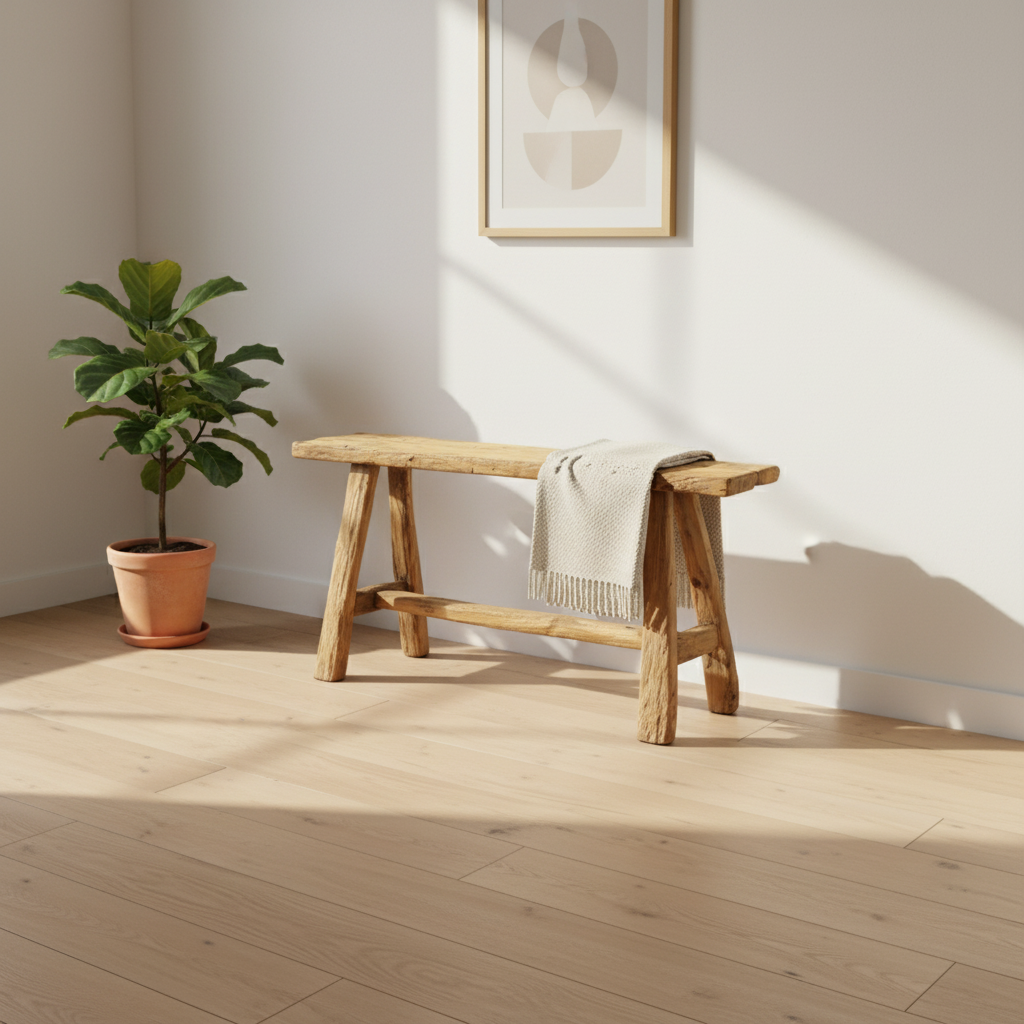 Een prachtig houten bankje van teak hout met een stoer, robuust uiterlijk. Dit teakbankje is een geweldig accessoire en kan tevens worden gebruikt als side table, bijzettafeltje of zitbankje, ideaal om op te zitten. Het voegt een warme uitstraling toe aan je woonkamer en is passend bij verschillende interieurstijlen.